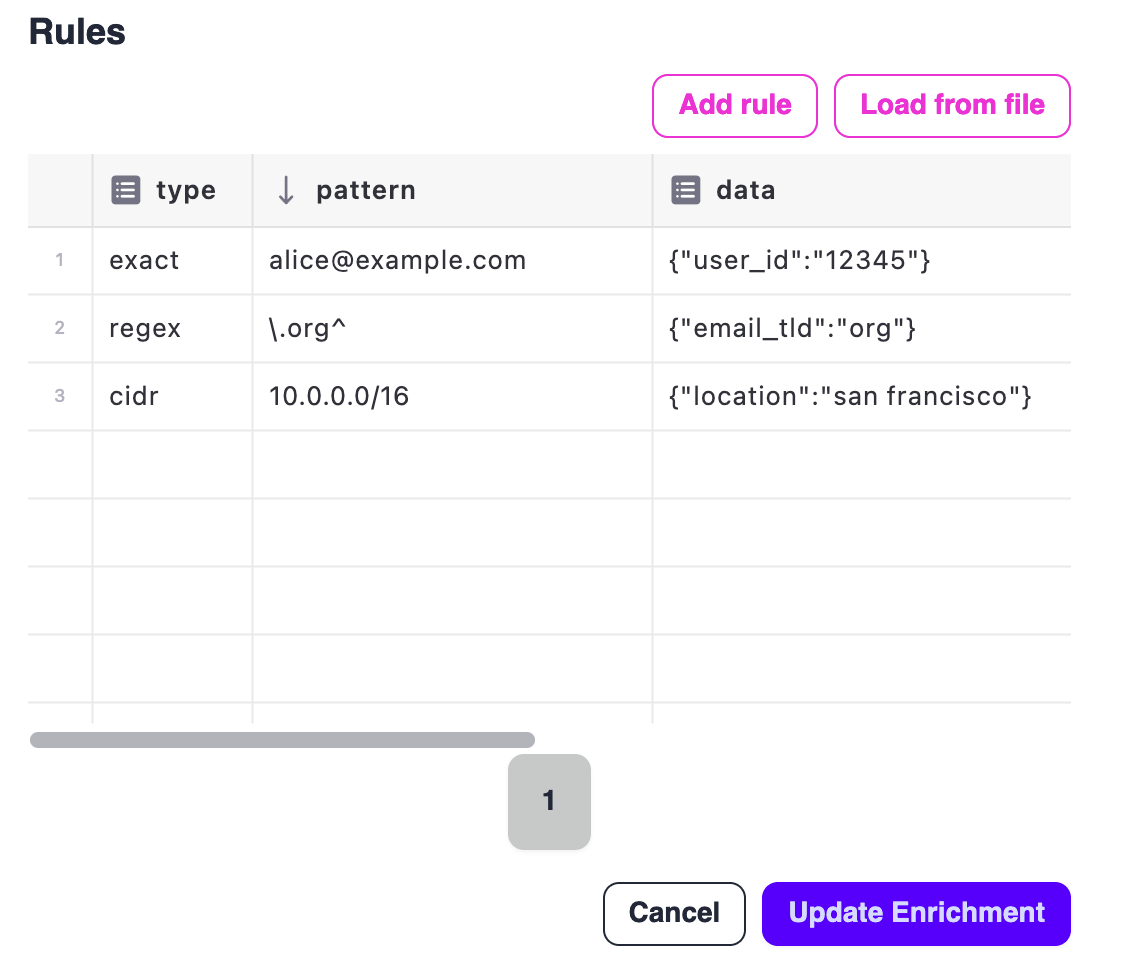 "cidr","10.0.0.0/16","{""location"":""san francisco""}"On the create/edit enrichment page, in the Rules section, you will find a Load from file button.