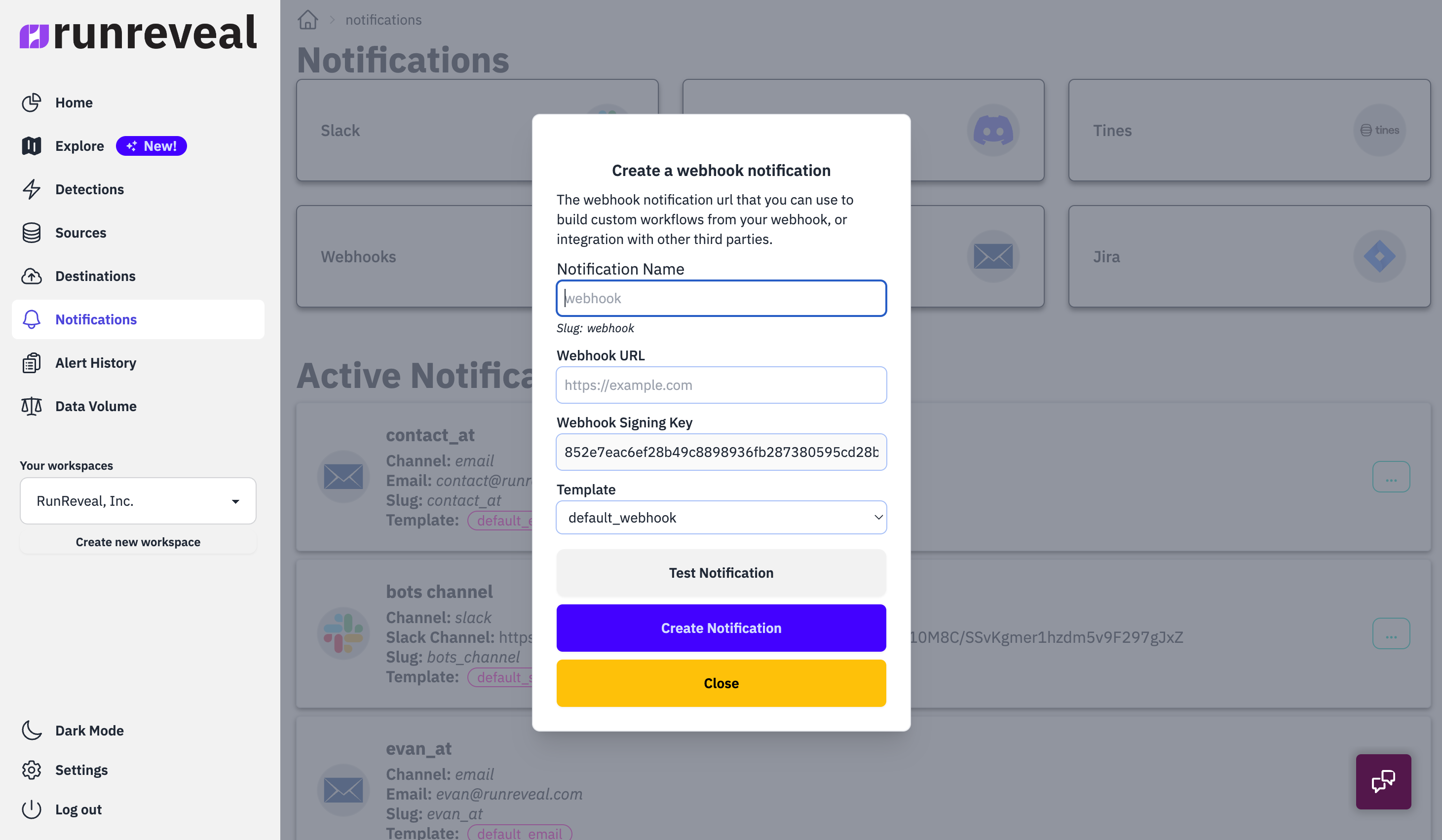 Set this up using the Notification page in the RunReveal dashboard.